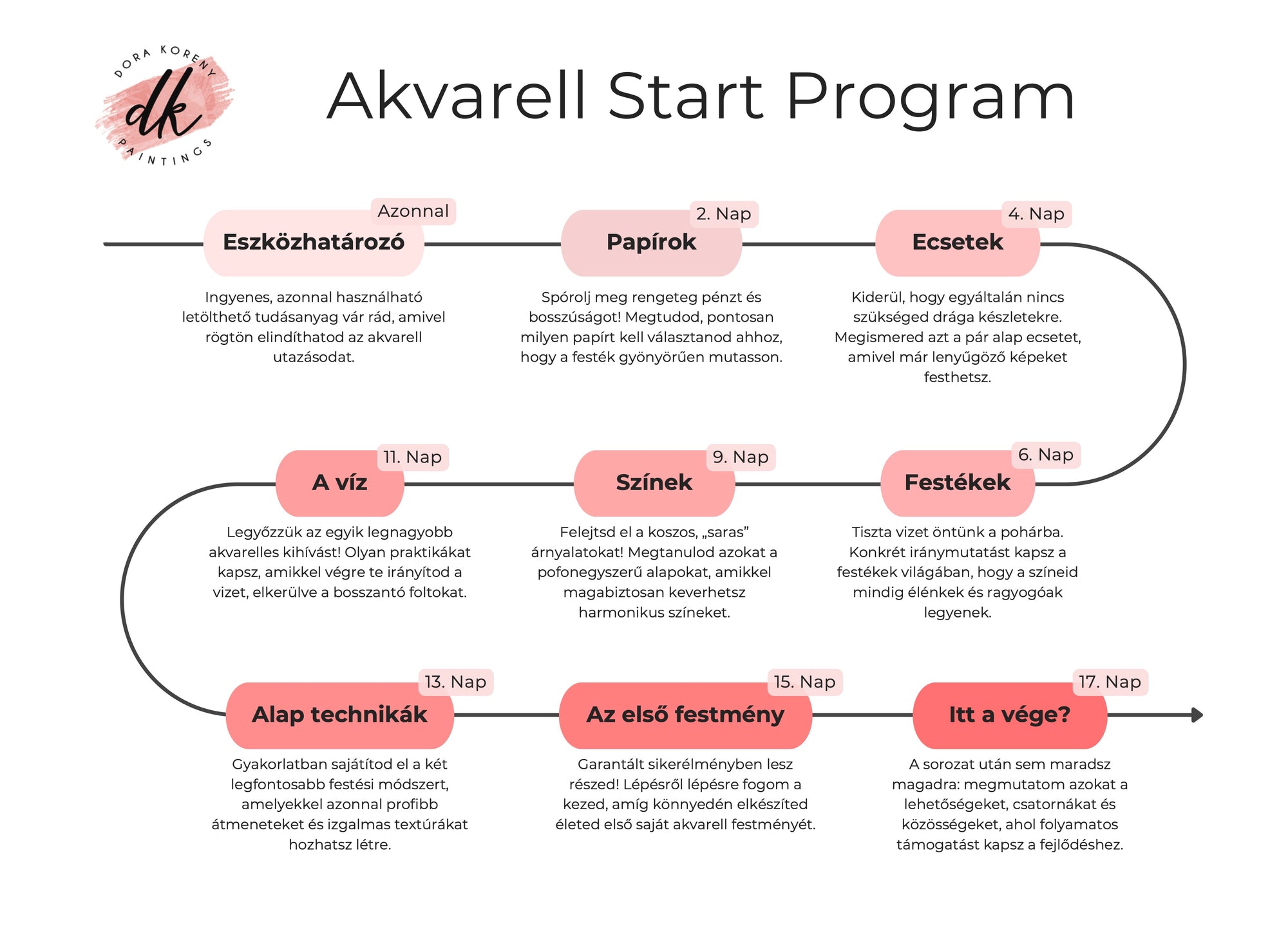 Az ingyenes email sorozat részeként minden nap egy-egy rövid, maximum 20 perces feladatot kapsz. Nem elméleti fejtegetéseket küldök, hanem azonnal kipróbálható technikákat trükköket, amikkel a nulláról építjük fel a magabiztosságodat az akvarell világában, kevesebb, mint 3 hét alatt!