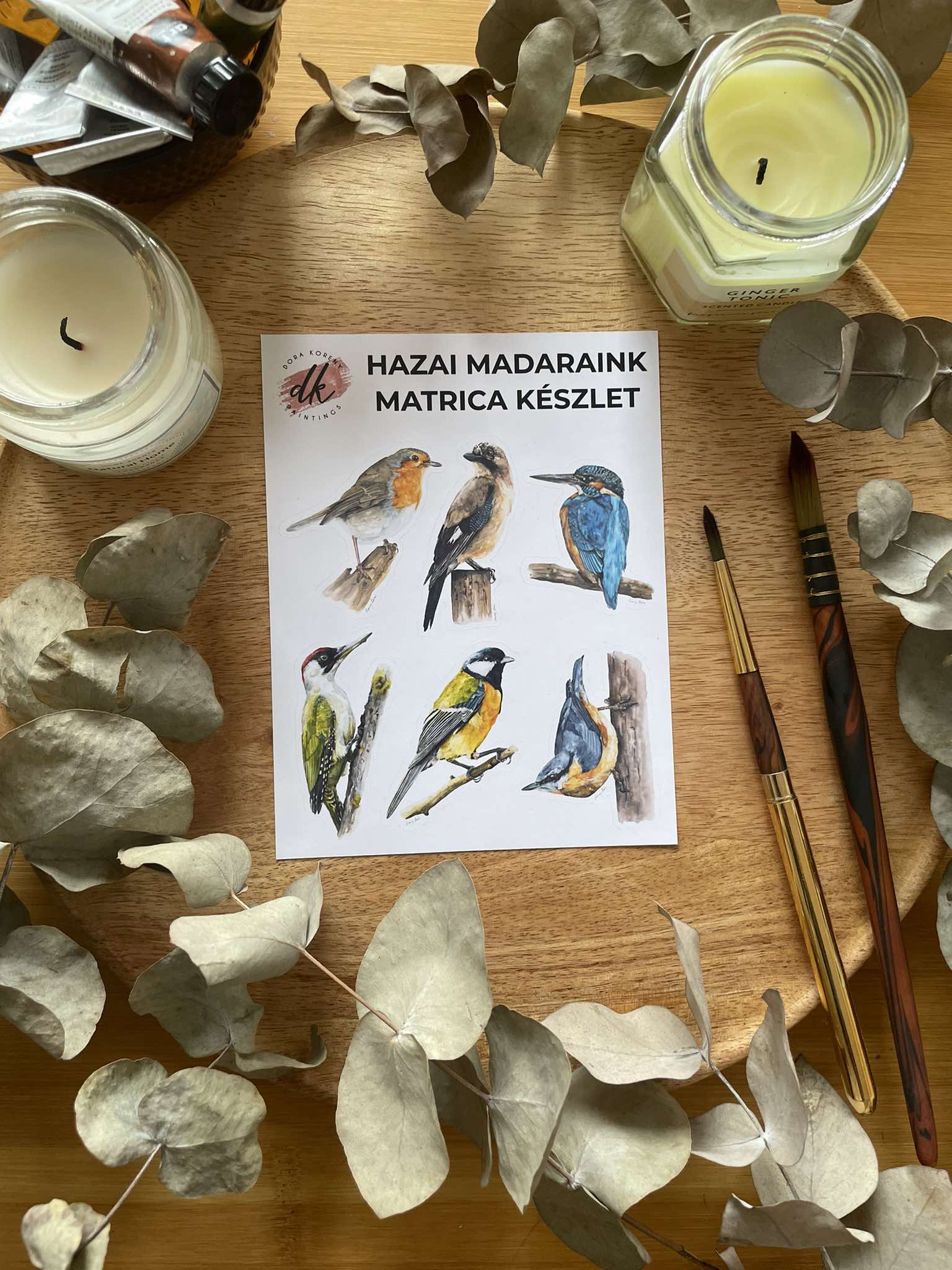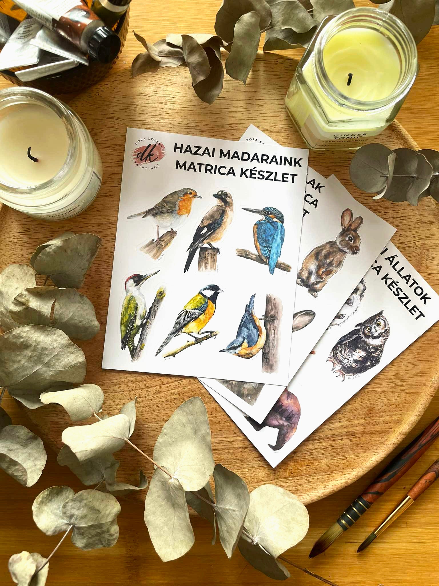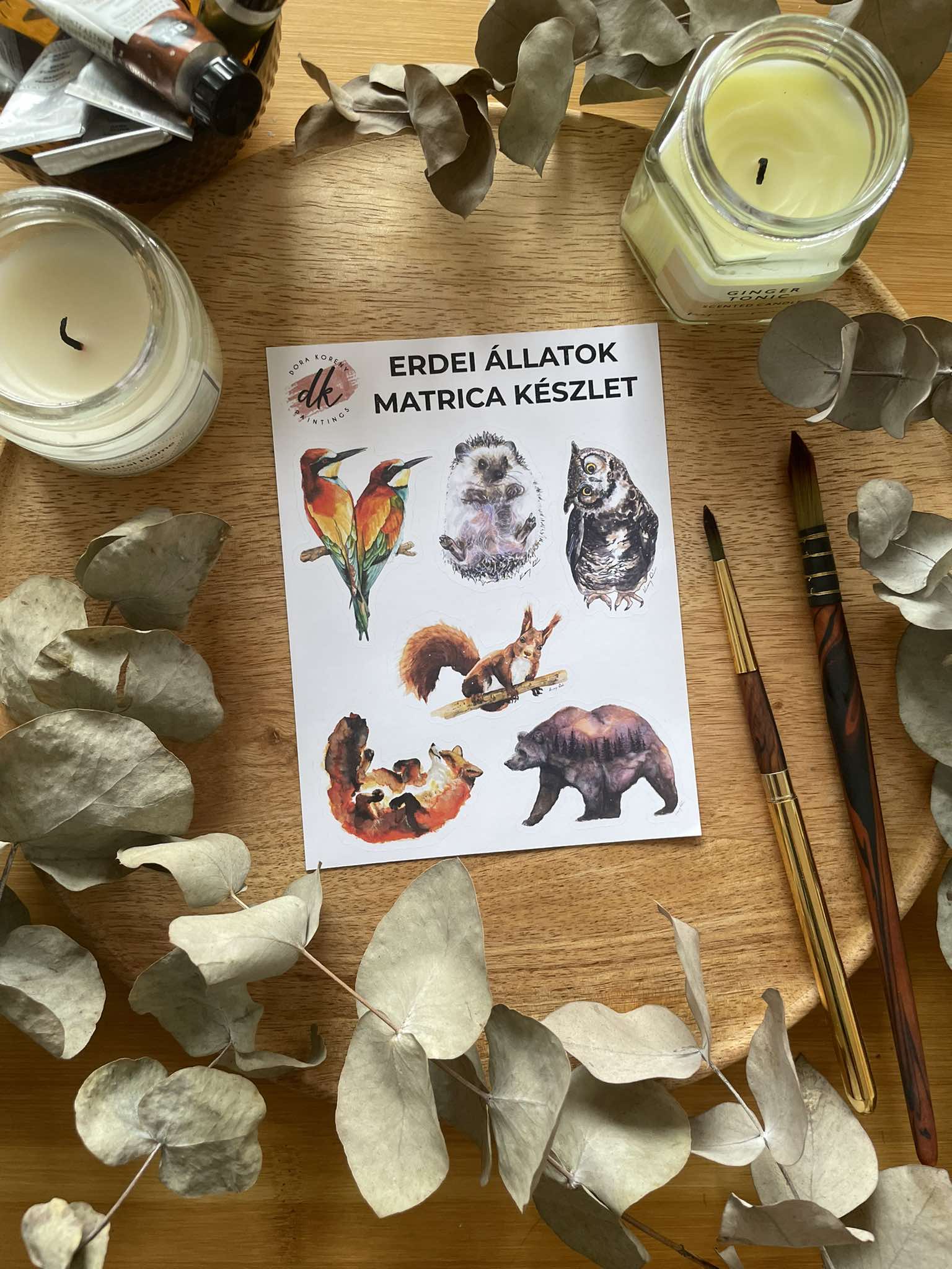 Bájos erdei lakók gyűjteménye, köztük gyönyörű színes gyurgyalagok, bébi süni, kíváncsi bagoly, játékos mókus és róka valamint az egyik legnépszerűbb festményem, az Erdő őre matrica formában.