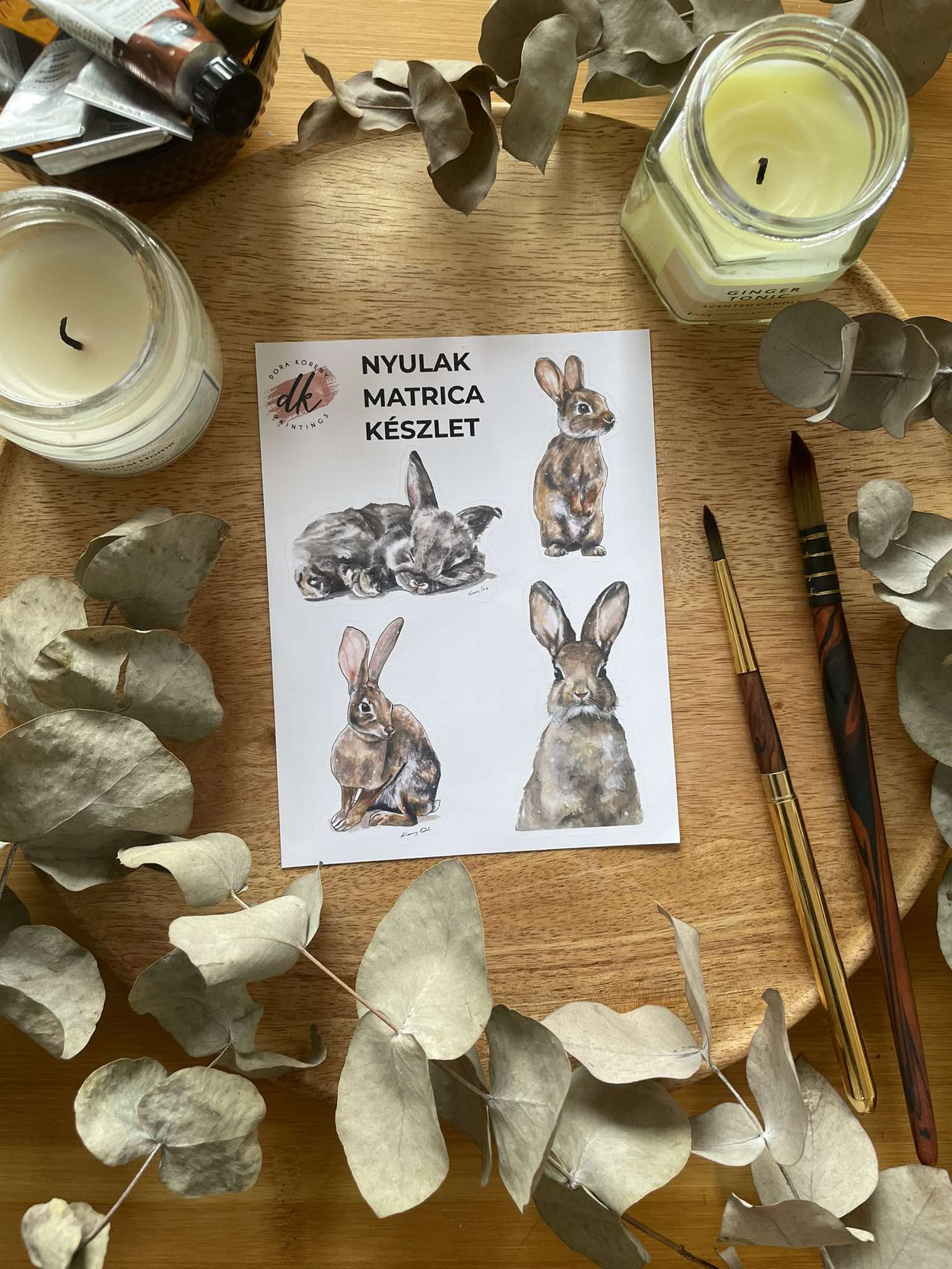 Négy varázslatos nyuszi portré egy íven, amelyek mindegyike egyedi személyiséget tükröz. Az alvó nyuszitól a kíváncsian figyelő kisnyúlig, minden matricán élethű akvarell részletek jelennek meg.