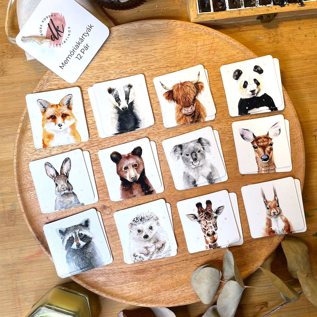 Fedezd fel az állatok varázslatos világát ezzel a különleges, kézzel festett akvarell memóriajátékkal! A 24 darabos készlet (12 pár) egyedi, művészi kivitelezésű kártyái természethű állatportrékkal várják, hogy részei legyenek a családi játékestéknek.