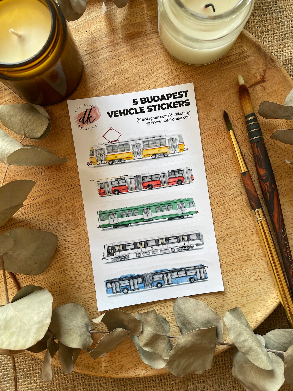 Ez a matricaív 5 híres budapesti közlekedési eszközt ábrázol, amelyeket eredetileg akvarell technikával festettem meg. Minden jármű egy darabka városi hangulatot hoz el a mindennapjaidba – legyen szó villamosról, troliról vagy metróról. A matricák tökéletesek noteszek, naplók, laptopok vagy ajándékok díszítésére, és mindenhol jól mutatnak, ahol egy kis Budapest-érzést szeretnél csempészni a napodba.