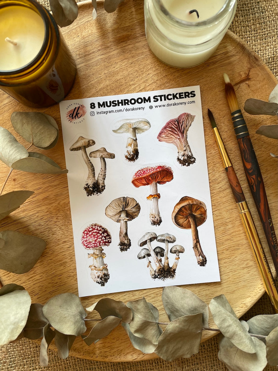 Ez a matricaív 8 különböző gombafajtát ábrázol. Az eredeti festmény akvarell technikával készült, nagy odafigyeléssel a részletekre és a természetes színekre. A matricák tökéletesek noteszek, naplók, laptopok vagy akár ajándékok díszítésére – mindenhol jól mutatnak, ahol egy kis természetközeli hangulatra vágysz.