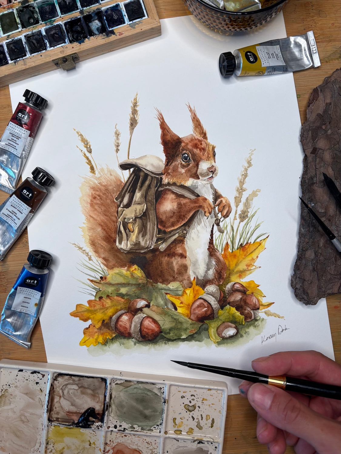 A festmény kiváló minőségű, 300g/m2 súlyú akvarellpapírra készült, professzionális akvarellfestékekkel. Ez a kombináció biztosítja az élénk színek tartósságát és a részletek gazdagságát.