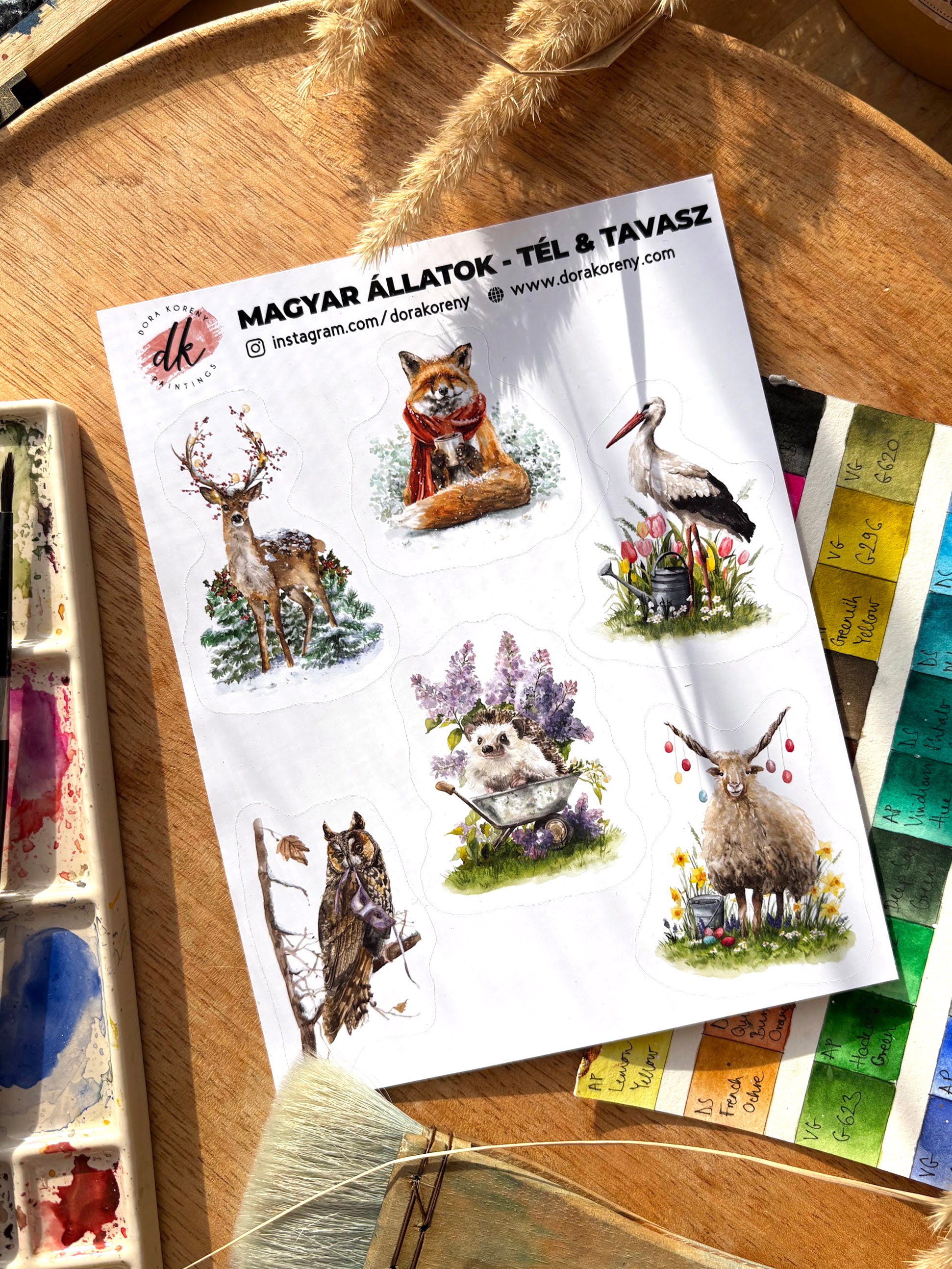 Ezen a matricaíven a magyar táj mesés lakói elevenednek meg: téli róka, karácsonyt váró őz, kíváncsi süni, gólya, álmos bagoly és játékos racka juh tavaszi mezőn. Vidám hangulatú illusztrációk, amelyek a tél és tavasz varázsát hozzák el a mindennapokba.